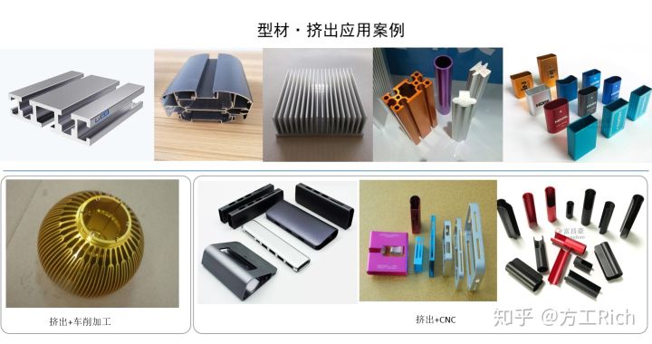 家里鋁合金門窗的邊框,工廠內(nèi)一些設(shè)備框體都是型材擠出的。型材擠出后獲得的是統(tǒng)一截面的拉伸體,當(dāng)然,要獲得最終制品,一般還需要后續(xù)的加工作業(yè)。下圖展示了一些典型的型材擠出應(yīng)用案例。