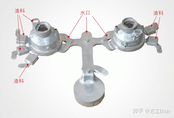 壓鑄工序需要經(jīng)過原材料熔煉,壓鑄成型,去渣料,和表面處理等工藝。壓鑄由于是高溫液態(tài)金屬進(jìn)入到模具型腔中固化成型,先進(jìn)入模具型腔中的金屬液體容易與空氣中的氧發(fā)生氧化反應(yīng)而影響產(chǎn)品品質(zhì),因此壓鑄模具都會(huì)設(shè)計(jì)渣包來儲(chǔ)存這些被氧化的渣料。