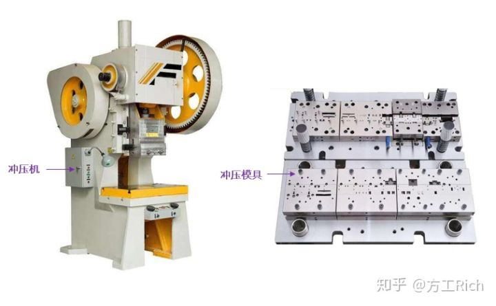 原理:利用沖床或油壓機(jī)的壓力,配合模具將板料進(jìn)行剪切、變形、折彎等工藝來獲得制品的方法。