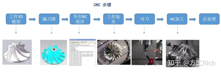 上圖說明的是CNC的加工步驟,根據(jù)工件的3D模型編刀路,然后導(dǎo)出NC程序到數(shù)控機(jī)臺(tái),再經(jīng)工件裝夾,對(duì)刀,使得工件的編程原點(diǎn)和機(jī)臺(tái)加工的原點(diǎn)重合。