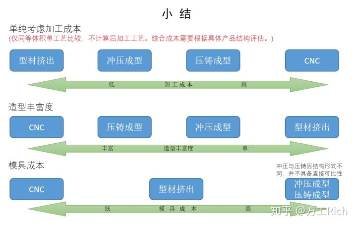 此處做一個(gè)小結(jié),從加工成本,造型和結(jié)構(gòu)的豐富程度以及模具成本方便考量做個(gè)簡(jiǎn)單的對(duì)比。僅僅作為參考,畢竟具體考量還需要根據(jù)具體的結(jié)構(gòu)和工藝而定。