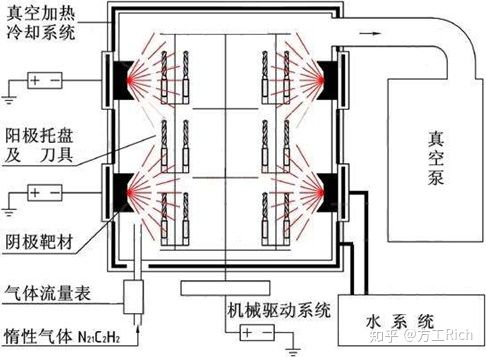 原理:將惰性氣體或反應(yīng)氣體電離成離子,在電場(chǎng)的作用下轟擊靶材(電鍍消耗的材料),靶材濺射出來的原子或分子在電場(chǎng)的加速下沉積在工件表面而形成電鍍層。(鍍層具有高硬度,高耐磨性)