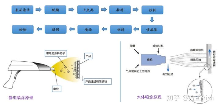 原理:利用壓力或靜電力將油漆或粉末附著在工件表面,并經(jīng)過烘烤后在工件表面形成防腐蝕的裝飾層。